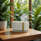 Cementbasen rymmer elektroniken säkert, medan den handblåsta glasdiffusorn ger visuell lätthet och elegans. Diskret LED-belysning framhäver glaset och skapar en subtil, lugnande närvaro.