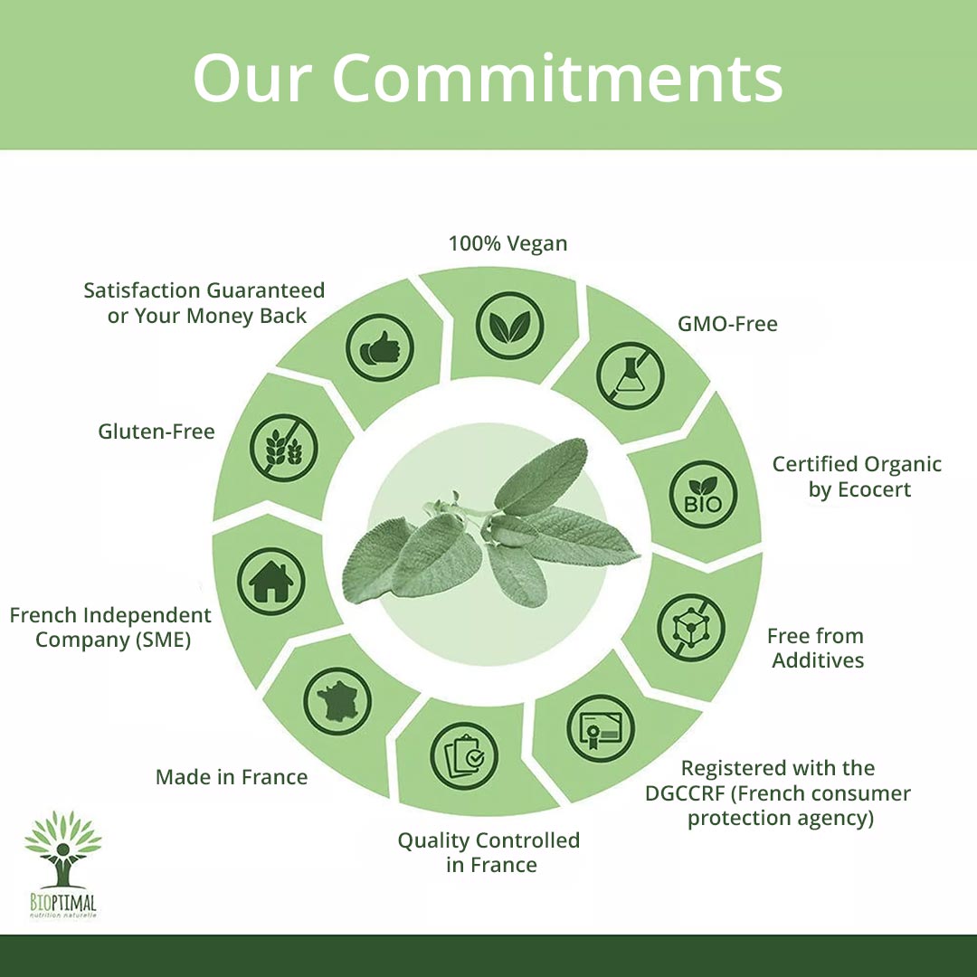 Tillverkade i Frankrike enligt de högsta kvalitetsstandarderna, våra kosttillskott kapslas in i vegetabiliska kapslar – aldrig tabletter – för att undvika onödiga eller kontroversiella tillsatser. Fri från fyllnadsmedel, talk, stearater, GMO, bekämpningsmedel och gluten, våra salviakapslar är laboratorietestade och certifierade ekologiska (AB), HACCP+ och Afnor-kompatibla.