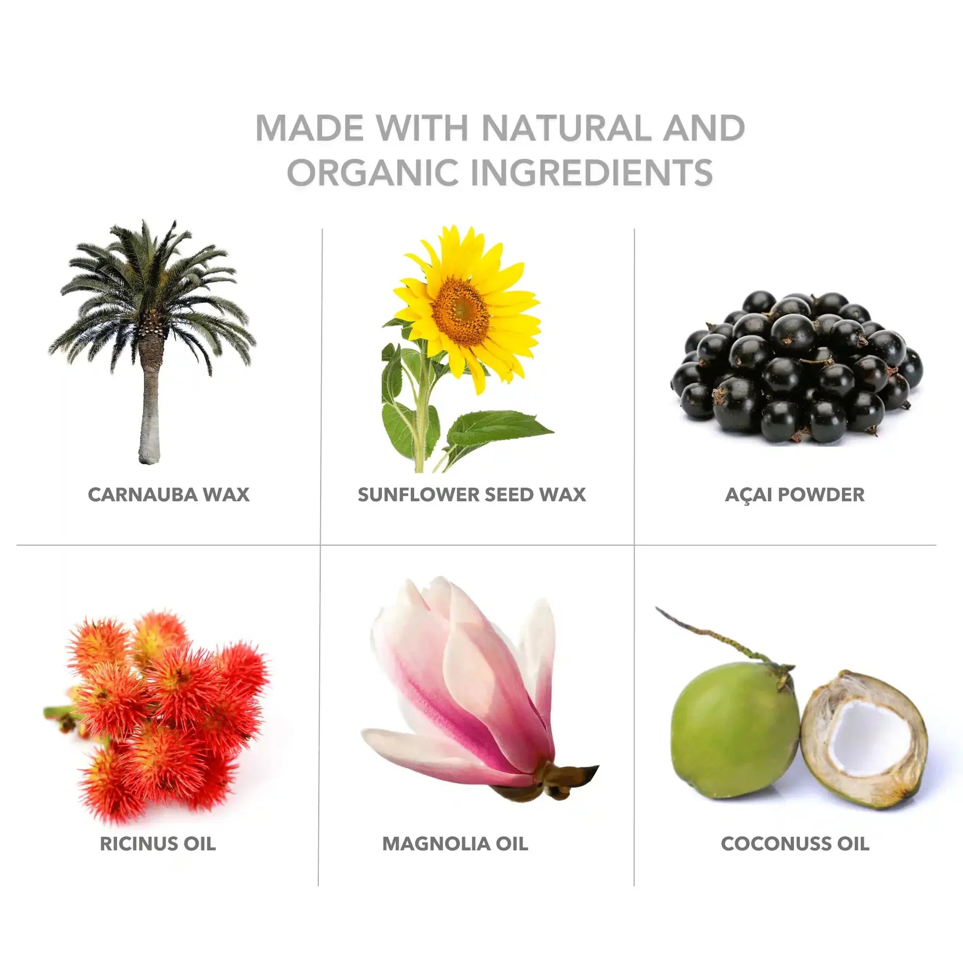 Hordeum Vulgare (Korn) Stjälkvattnet*, Helianthus Annuus (Solros) Frö Cera, CI 77499 (Järnoxid), Polyglyceryl-3 Diisostearate, Polyglyceryl-6 Distearate, Glyceryl Stearate, Pentylene Glycol, Undekan, Pullulan, Copernicia Cerifera (Carnauba) Cera, Coco-Caprylate/Caprate, Glyceryl Behenate, Stearinsyra, Palmitinsyra, Acacia Senegal Gummi, Butylenglykol, Triheptanoin, Tridekan, Glycerin, Olje-/Linol-/Linolensyra Polyglycerider, Hydrogenerade Olivolja Stearyl Estrar, Aqua, C9-12 Alkan, Dilinolensyra/Butandiol Kopolymer, Bensylalkohol, Natriumhydroxid, Sorbitol, Trehalos, Ricinus Communis (Ricin) Fröolja*, Citronsyra, Kaliumsorbat, Natriumbenzoat, Magnolol, Honokiol, Ricinolja/IPDI Kopolymer, Euterpe Oleracea (Açaí) Pulp Pulver*