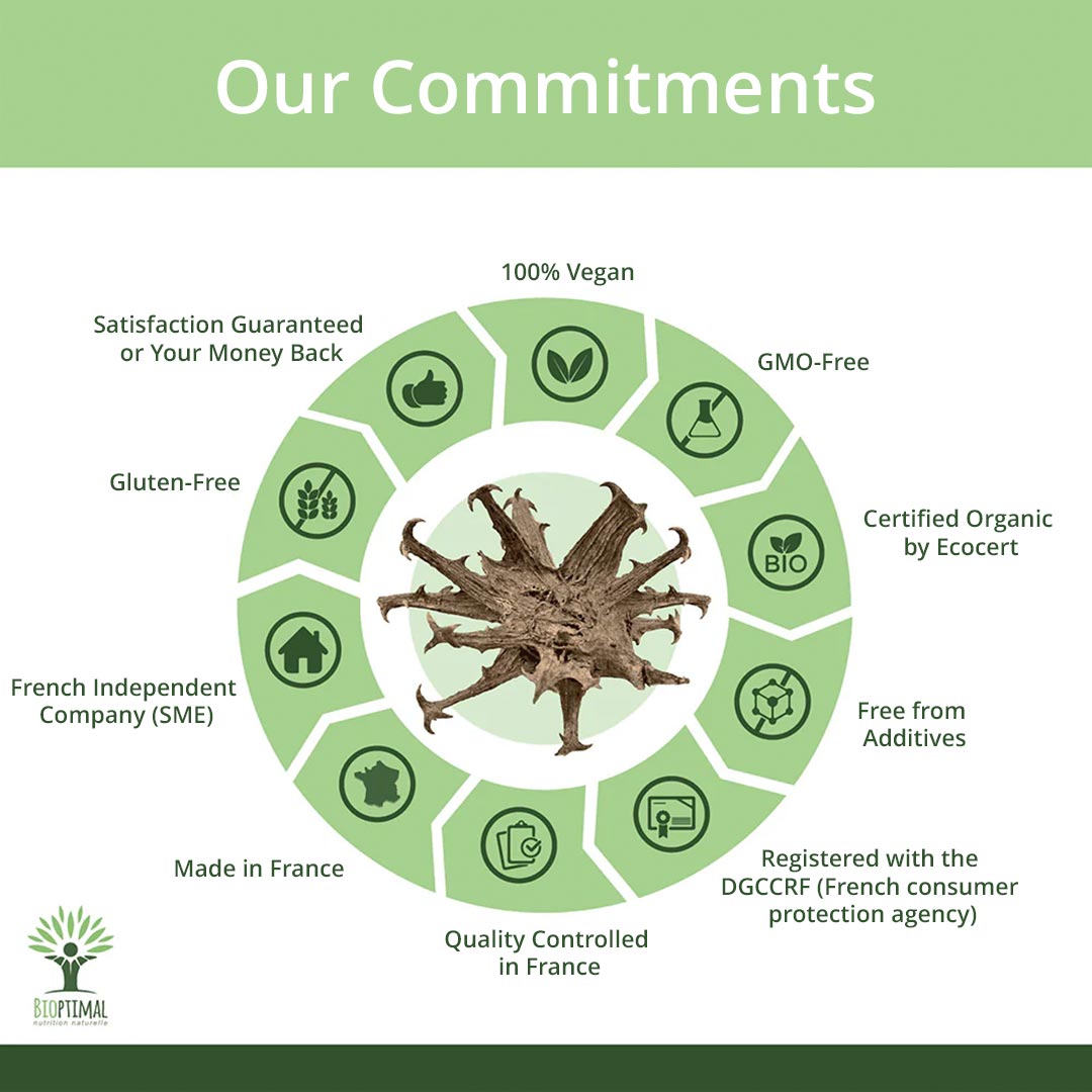 Våra kosttillskott tillverkas i Frankrike under strikt kvalitetskontroll. Vi kapslar in vår ekologiska Devil’s Claw i växtbaserade kapslar - aldrig tabletter - för att undvika kontroversiella ingredienser som talk, stearater eller magnesiumkarbonat.