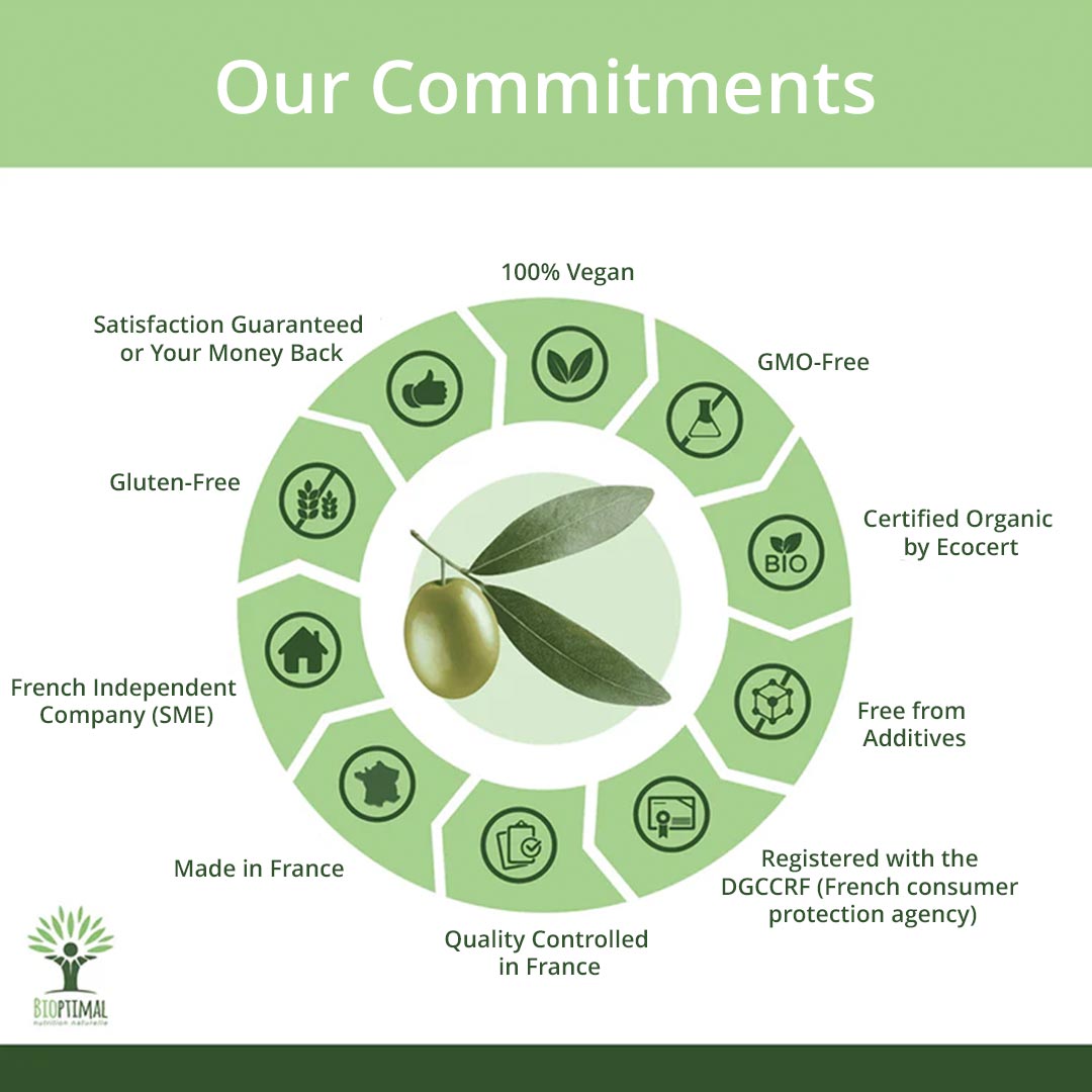Producerad och kapslad i Frankrike med rena vegetabiliska kapslar. Fri från talk, stearater, magnesiumkarbonat, GMO, bekämpningsmedel, gluten och konstgjorda tillsatser. Laboratorietestad i Frankrike och certifierad ekologisk, HACCP+ och AFNOR.
