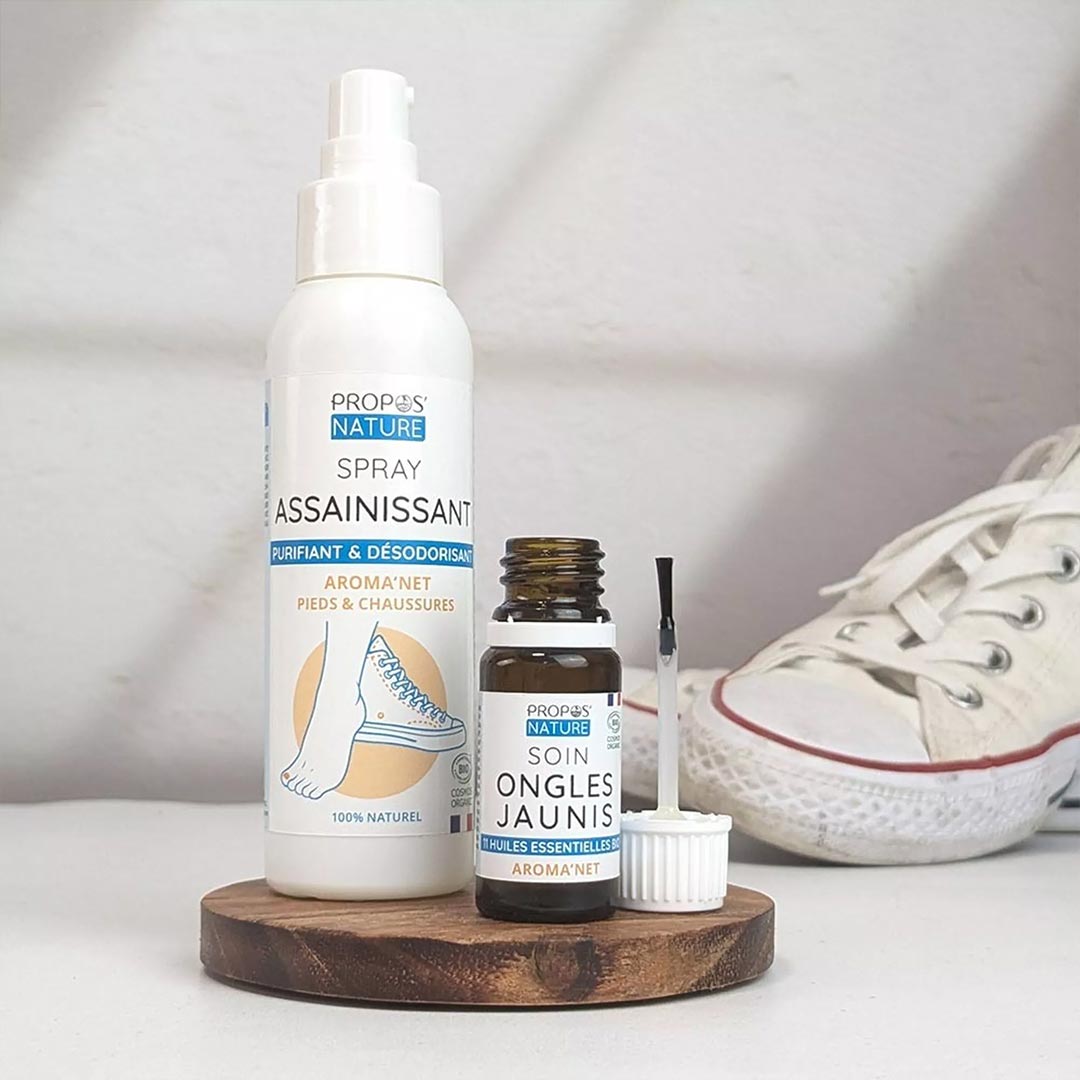 Upptäck det naturliga sättet att ta hand om dina fötter och skor med Aroma’Net Sanitizing Spray, en lugnande och vårdande behandling gjord av en synergi av 6 ekologiska eteriska oljor. Utformad för att både förebygga och behandla problem orsakade av fukt, hjälper den till att skydda naglar och hud samtidigt som den håller obehagliga lukter borta.